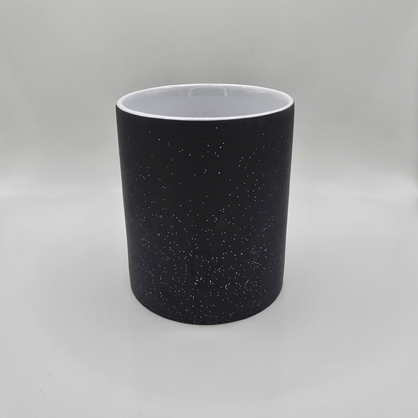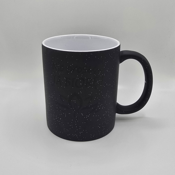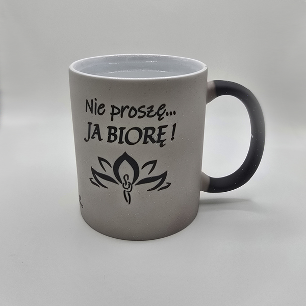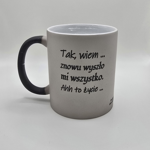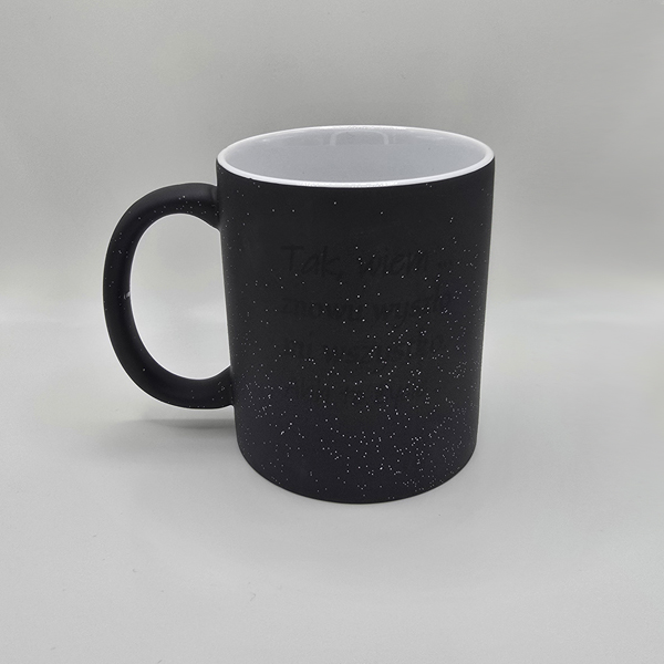 To magiczny kubek, który w pokojowej temperaturze jest z zewnątrz cały czarny. Po wlaniu gorącego napoju czarny kolor znika odsłaniając afirmacje.