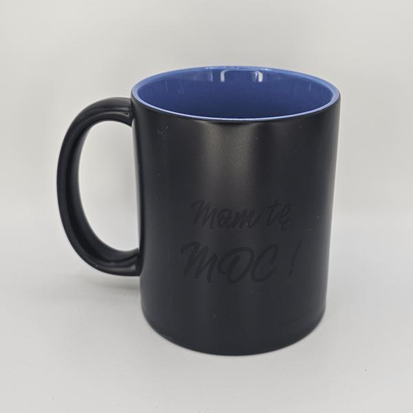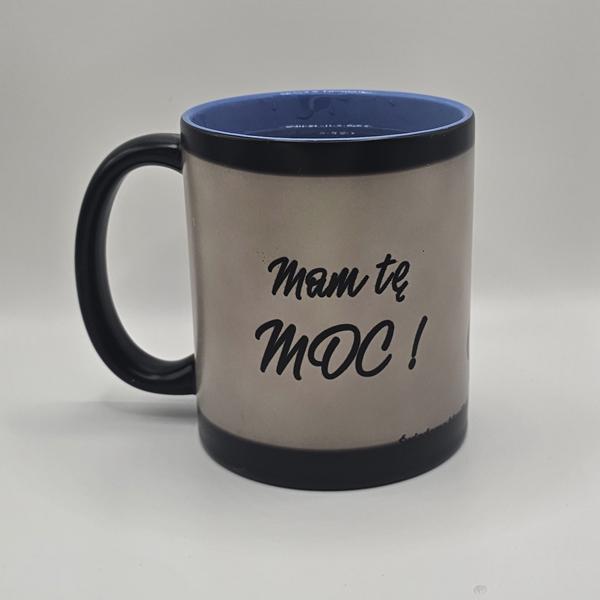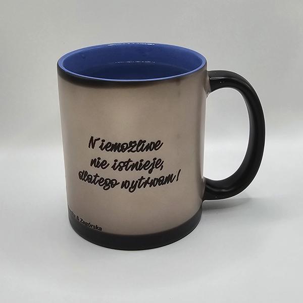 To magiczny kubek, który w pokojowej temperaturze jest z zewnątrz cały czarny. Po wlaniu gorącego napoju czarny kolor znika odsłaniając afirmacje.