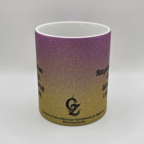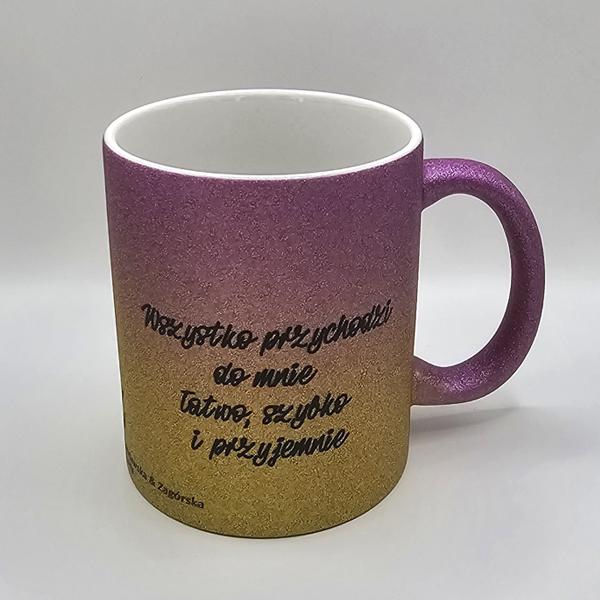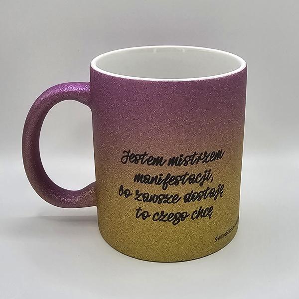 Piękny brokatowy kubek w kolorze złoto-różowego gradientu z afirmacjami po obydwu stronach.
