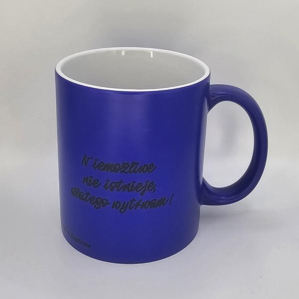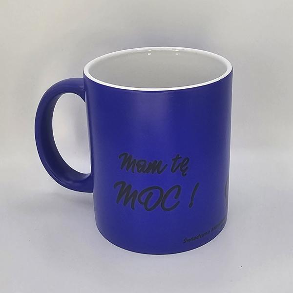 To magiczny kubek, który w pokojowej temperaturze jest z zewnątrz cały niebieski. Po wlaniu gorącego napoju niebieski kolor znika odsłaniając afirmacje.