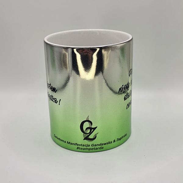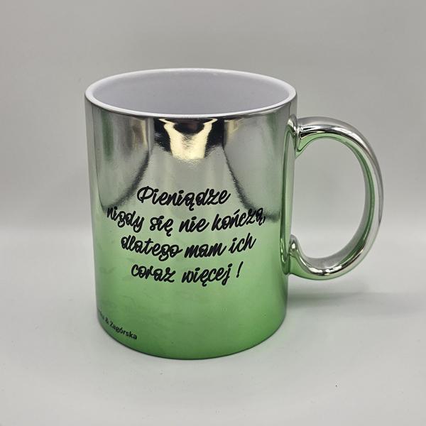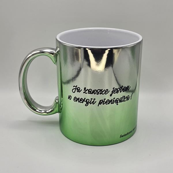 Kubek platerowany srebrno-zielony z afirmacjami po obydwu stronachDostępność: 5 w magazynie