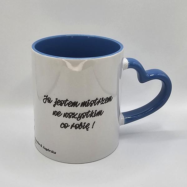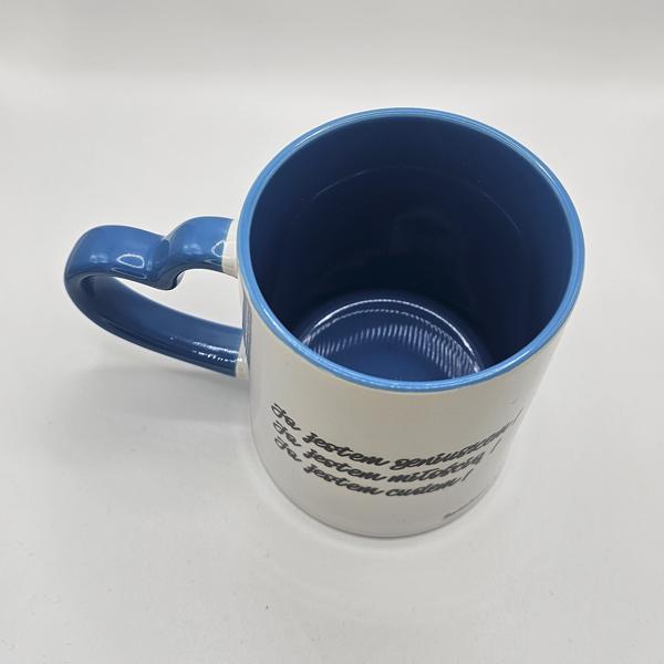 Kubek biały z błękitnym wnętrzem i uszkiem w kształcie serca z afirmacjami po obydwu stronach.Dostępność: 5 w magazynie