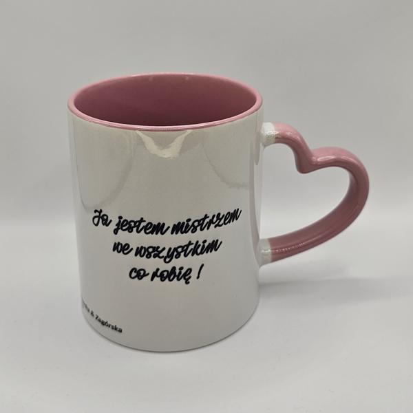 Kubek biały z różowym wnętrzem i uszkiem w kształcie serca z afirmacjami po obydwu stronach.Kubek biały z różowym wnętrzem i uszkiem w kształcie serca z afirmacjami po obydwu stronach.