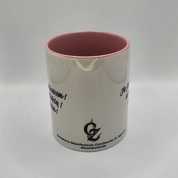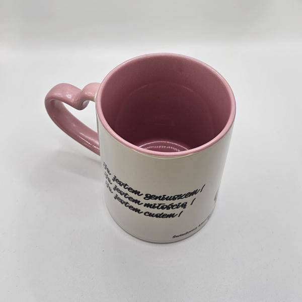 Kubek biały z różowym wnętrzem i uszkiem w kształcie serca z afirmacjami po obydwu stronach.