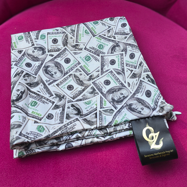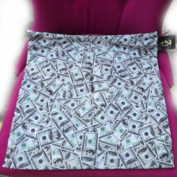 Poszewka Milionerka z nadrukiem obustronnym dolarów z ozdobną czarną metką z naszym logo. Poszewka jest szyta ręcznie – produkt „hand made”